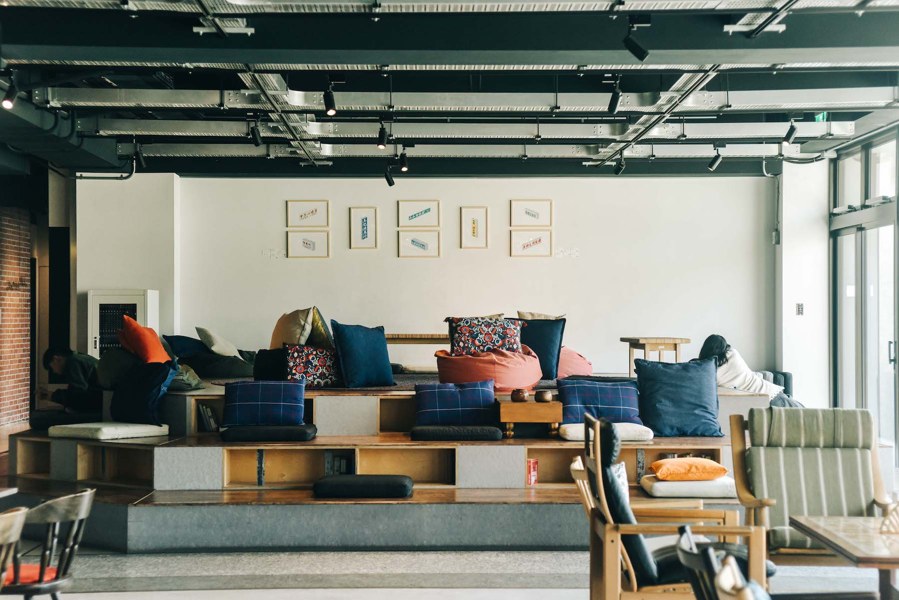 共享空间的你好沙龙,供人随意坐卧的梯台放置了五颜六色的舒适抱枕。